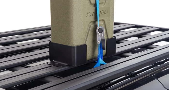 Lleve suficiente combustible o agua para llegar a su destino más remoto con el soporte individual para bidones Rhino-Rack. Este producto es una solución que ahorra espacio para sus bidones.